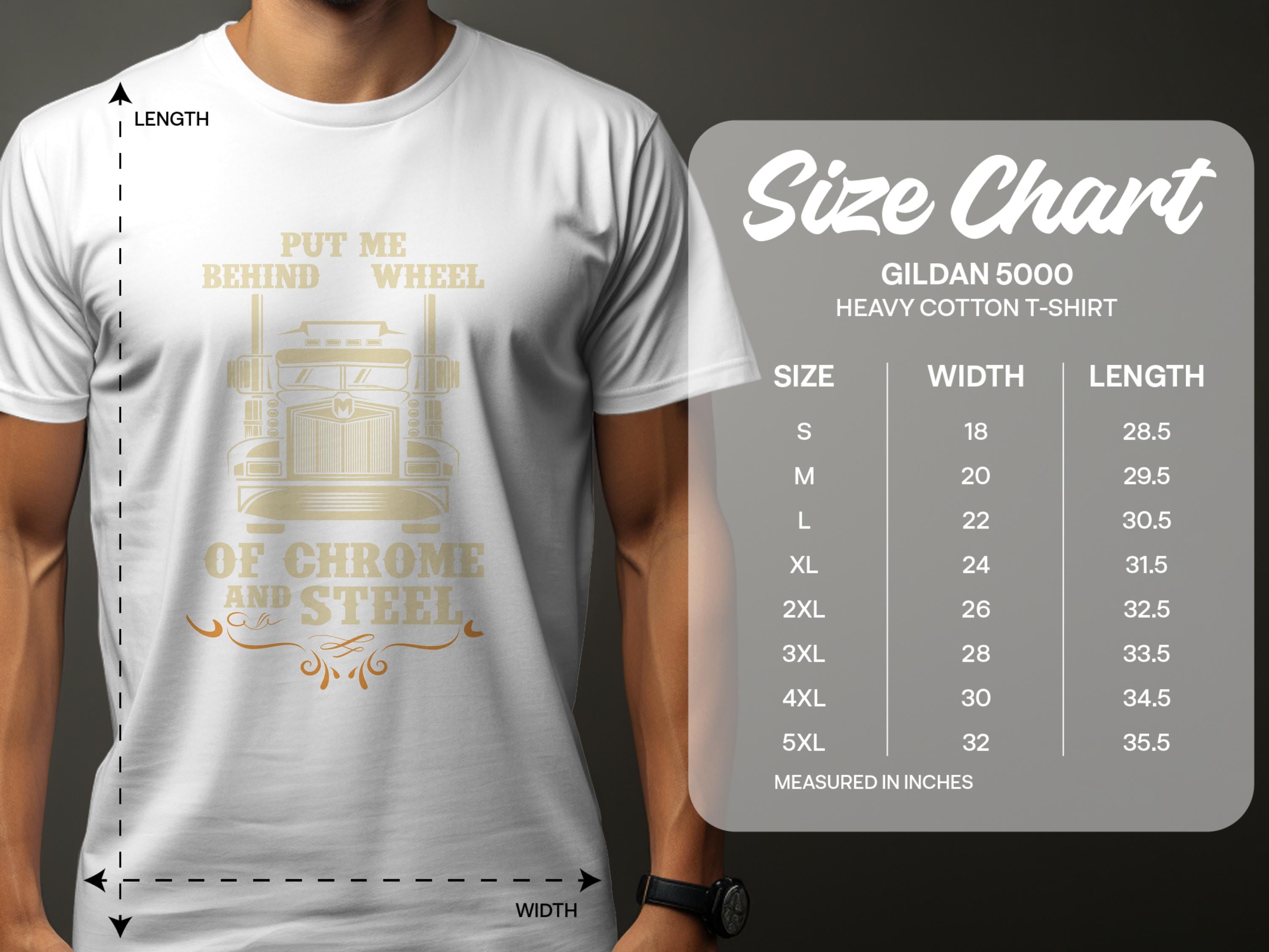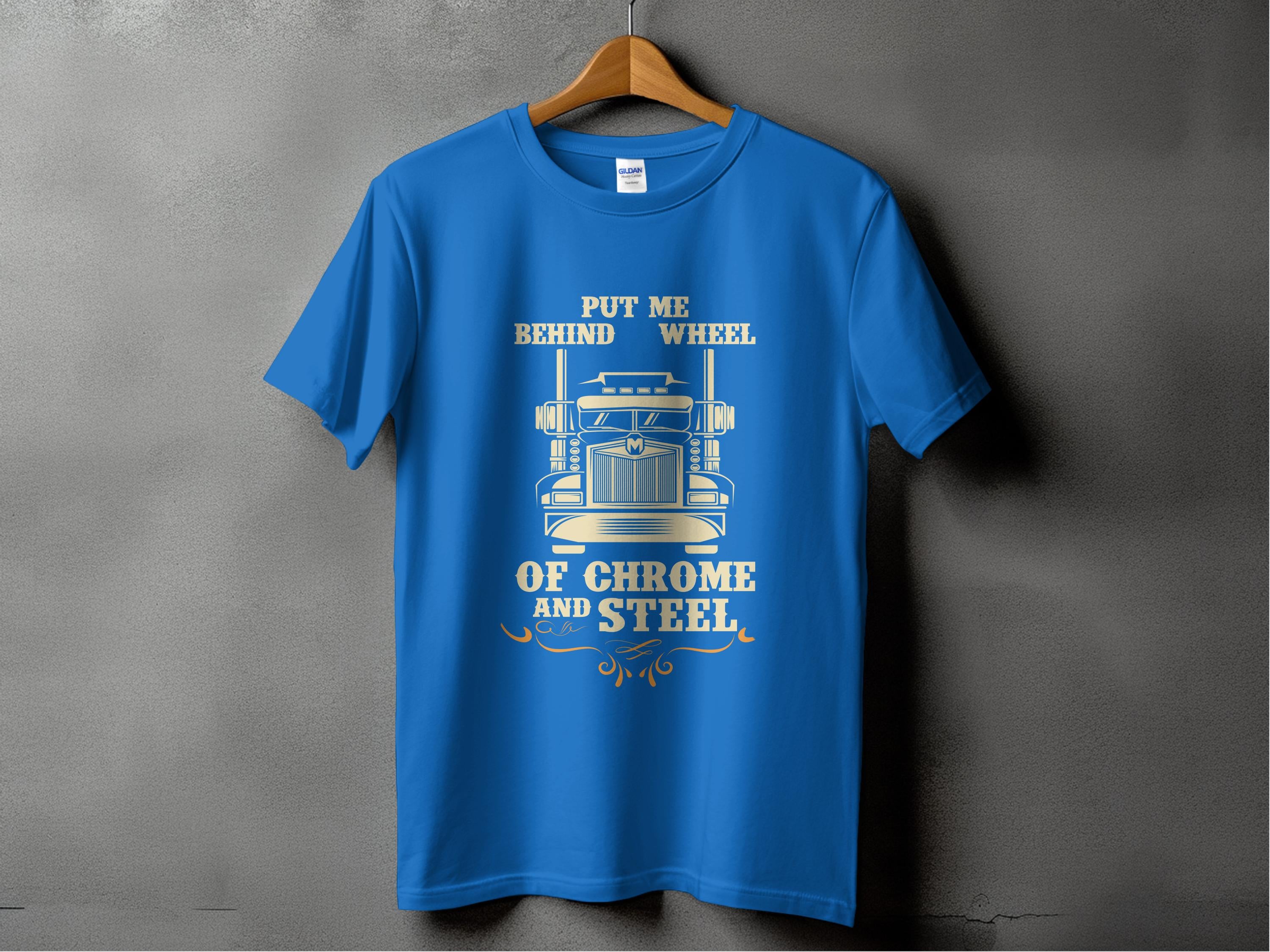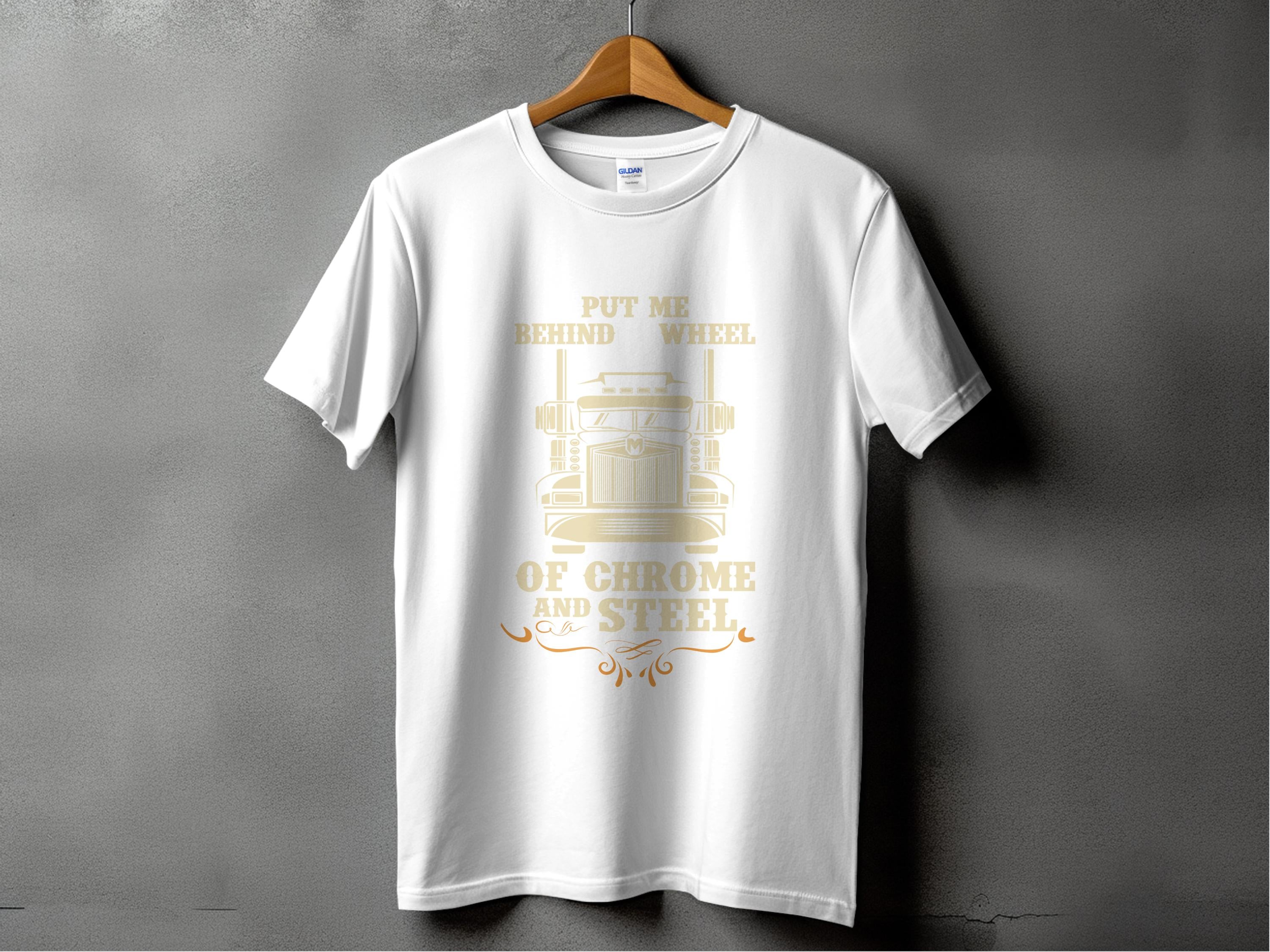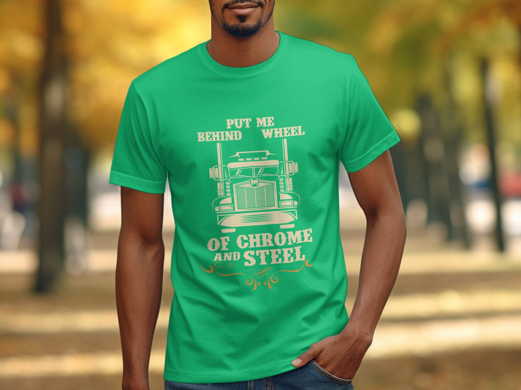 Express your love for trucking with our Put Me Behind Wheel of Chrome and Steel T-Shirts perfect for any truck enthusiast.